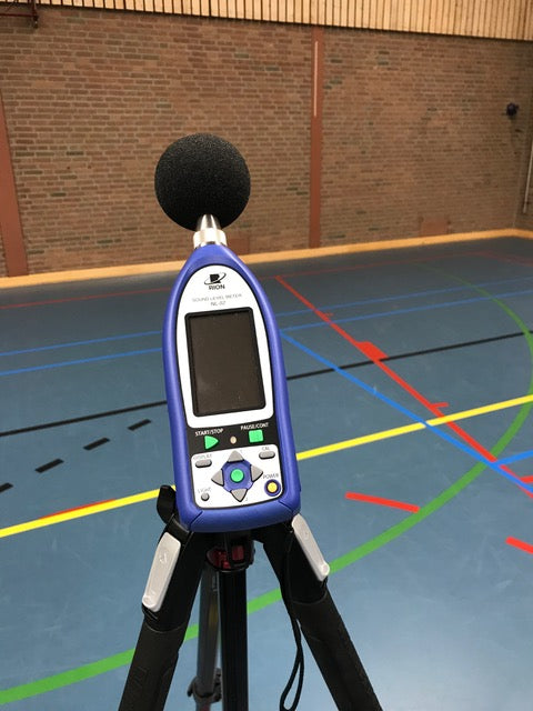 Met een geluidsmeter en een luidspreker brengen we de akoestiek in kaart. We laten een korte ruis van 90 dB horen en meten hoelang het duurt voordat het geluid verdwijnt. We meten over het hele spectrum van 125 tot 4000 Hz. Precies het bereik waarin stemgeluid en storende reflecties voorkomen.